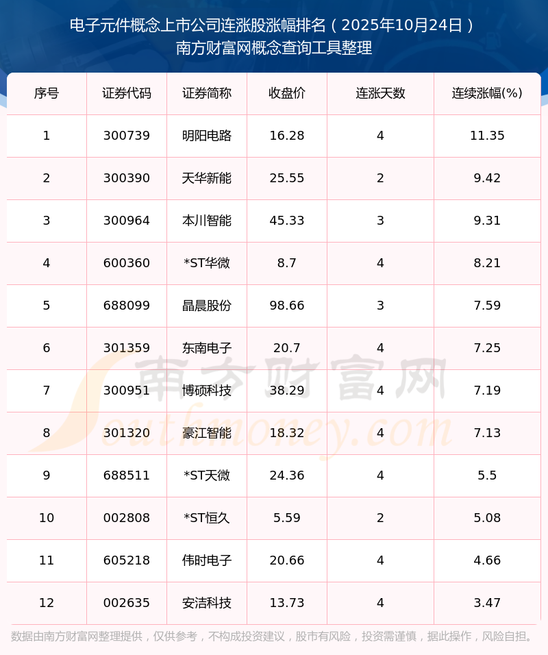 2025年10月24日電子元件概念上市公司連漲股漲幅排名