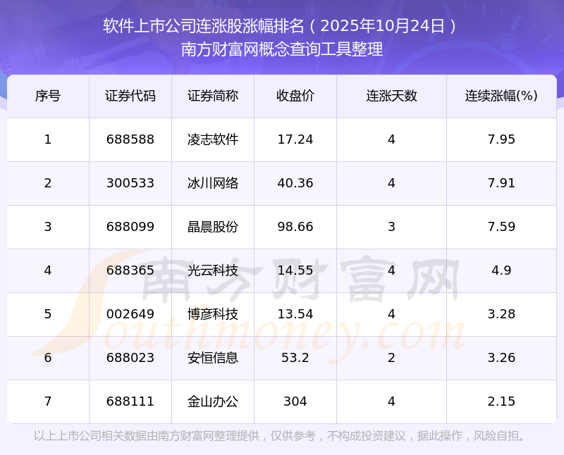 2025年10月24日軟件上市公司連漲股漲幅排名