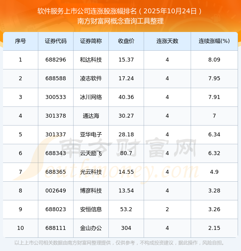 2025年10月24日軟件服務上市公司連漲股漲幅排名