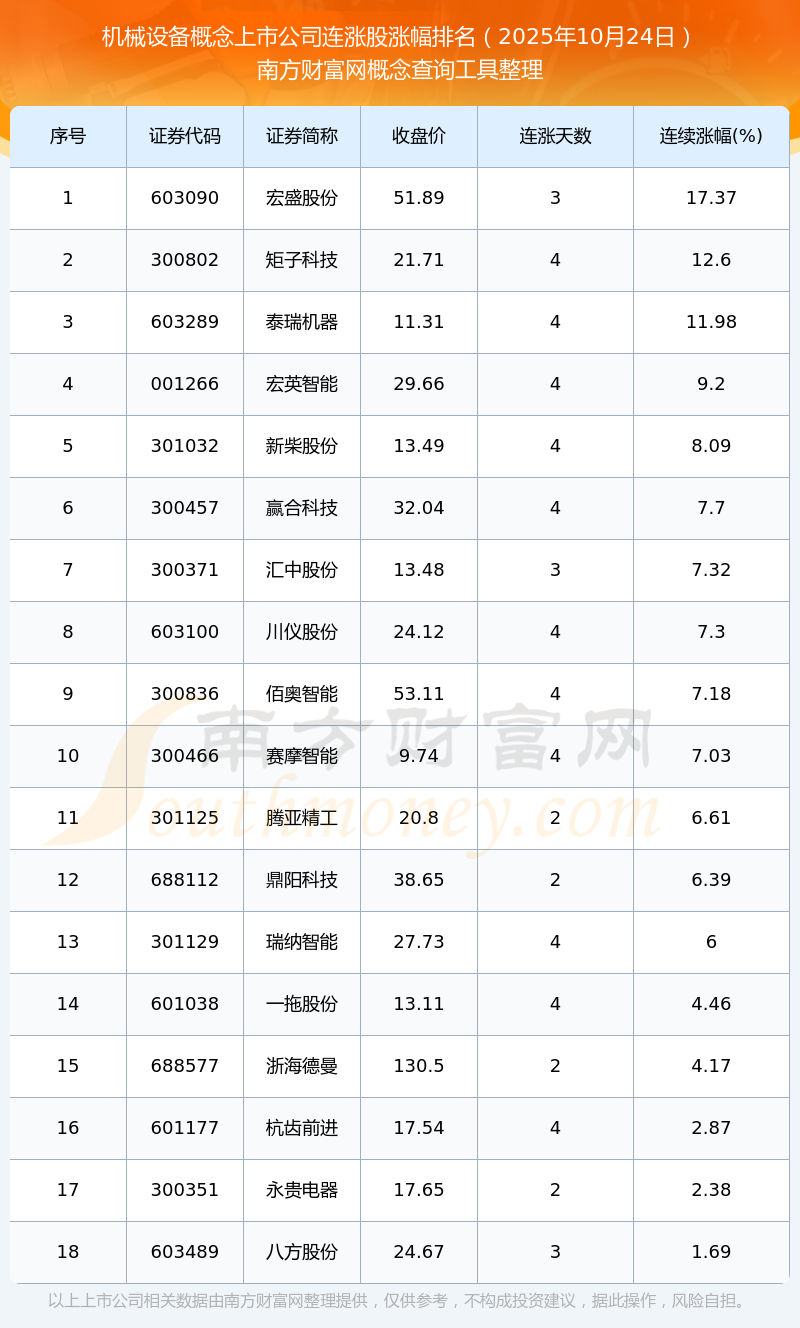 2025年10月24日機(jī)械設(shè)備概念上市公司連漲股漲幅排名