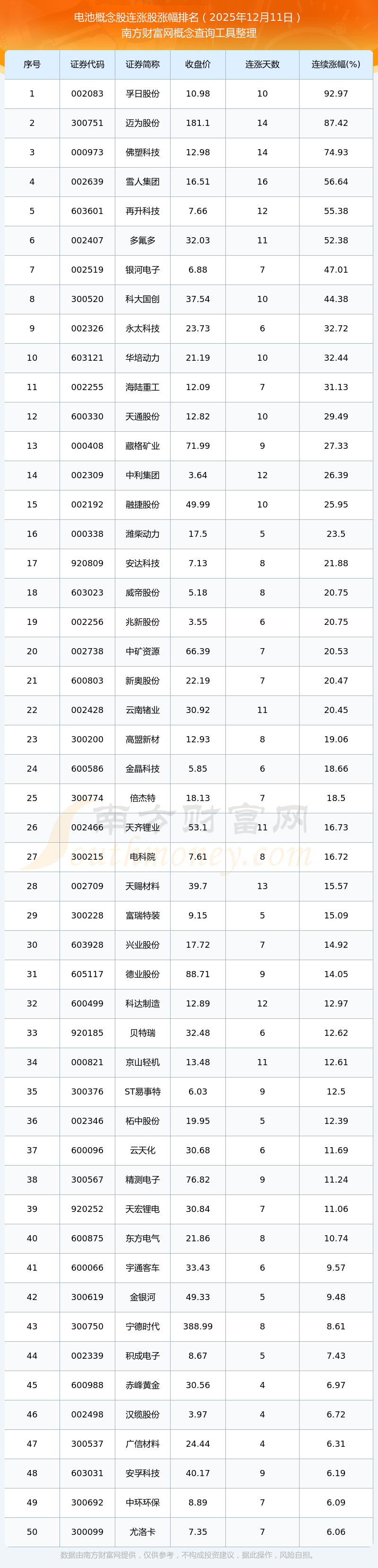 根據(jù)南方財(cái)富網(wǎng)概念查詢工具數(shù)據(jù)統(tǒng)計(jì),截止2025年12月11日收盤(pán),電池概念股共有97只個(gè)股實(shí)現(xiàn)連漲。其中連續(xù)漲幅較大的個(gè)股有孚日股份、邁為股份、佛塑科技等,連續(xù)漲幅分別為92.97%、87.42%、74.93%。