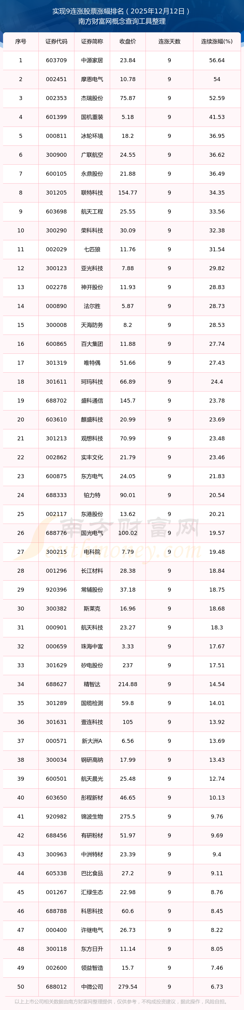 2025年12月12日實現(xiàn)9連漲股票漲幅排名