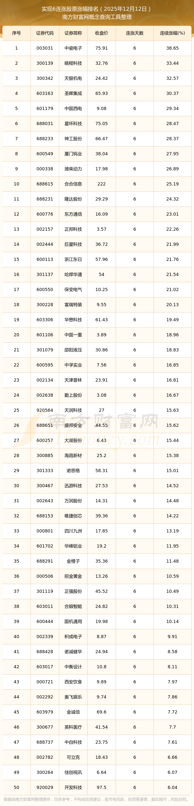 根據(jù)南方財富網(wǎng)概念查詢工具數(shù)據(jù)統(tǒng)計,截止2025年12月12日收盤,共有120只個股實現(xiàn)6天連漲。其中連續(xù)漲幅較大的個股有中瓷電子、曉程科技、天銀機(jī)電等,連續(xù)漲幅分別為38.65%、33.44%、32.57%。