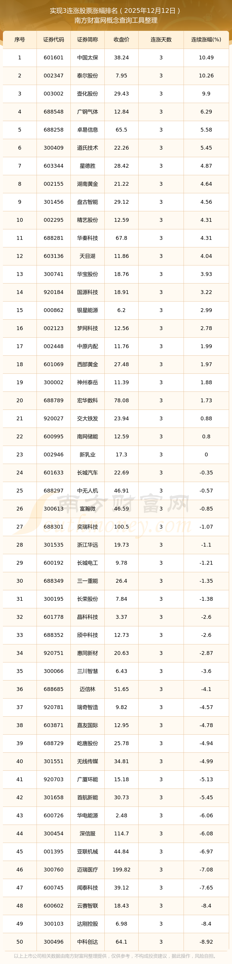 根據(jù)南方財富網(wǎng)概念查詢工具數(shù)據(jù)統(tǒng)計,截止2025年12月12日收盤,共有62只個股實現(xiàn)3天連漲。其中連續(xù)漲幅較大的個股有中國太保、泰爾股份、壺化股份等,連續(xù)漲幅分別為10.49%、10.26%、9.90%。