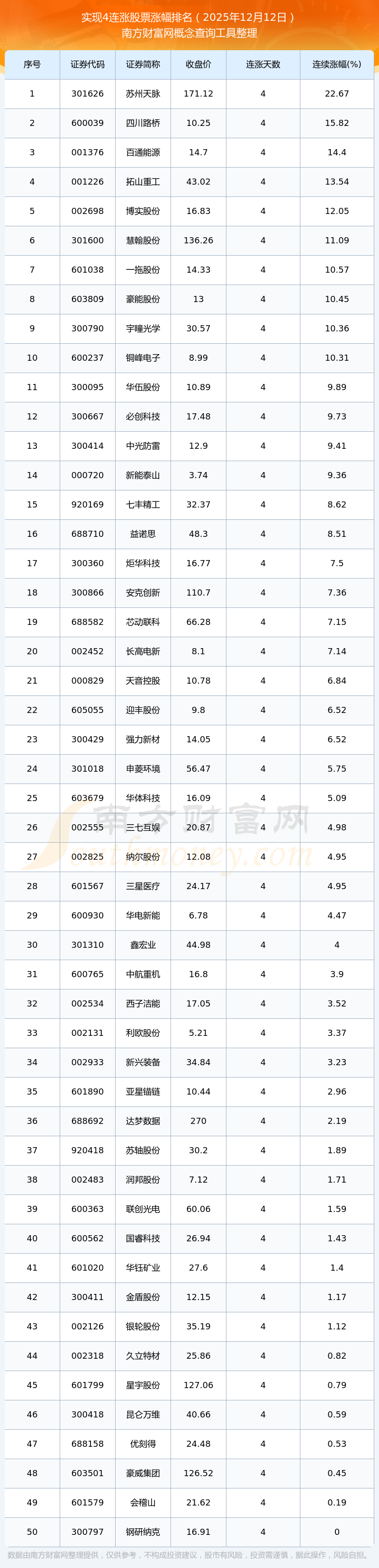 2025年12月12日實現(xiàn)4連漲股票漲幅排名