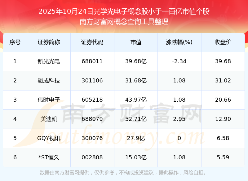 截止2025年10月24日,光學光電子概念股市值小于一百億的個股共有6只。其中,市值較高的有美迪凱、偉時電子、新光光電,市值分別為52.71億元、43.97億元、39.68億元。