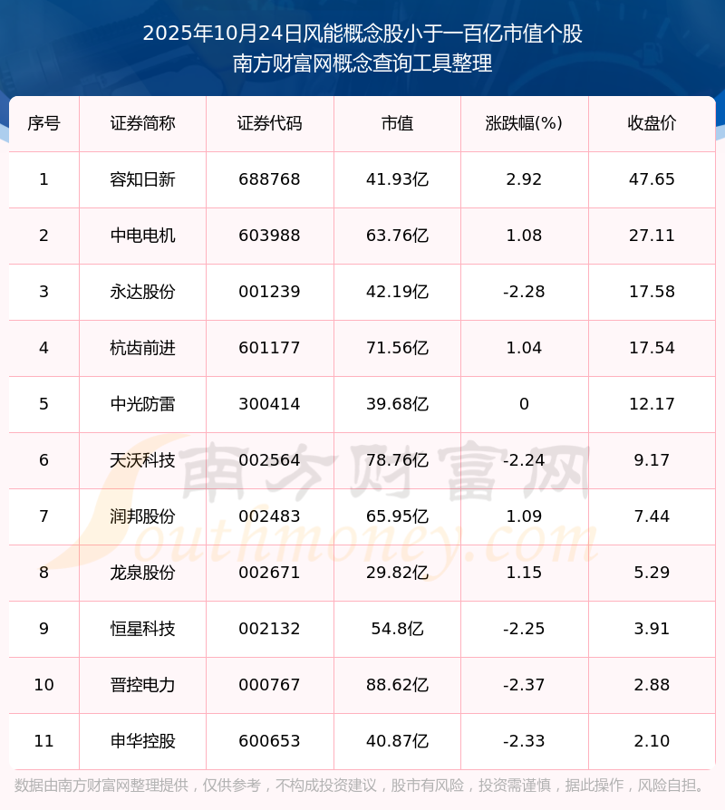 截止2025年10月24日,風能概念股市值小于一百億的個股共有11只。其中,市值較高的有晉控電力、天沃科技、杭齒前進,市值分別為88.62億元、78.76億元、71.56億元。