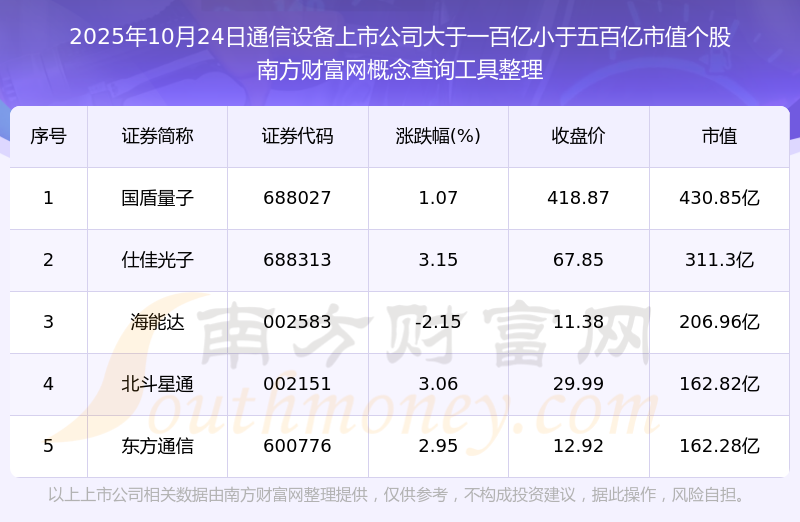 截止2025年10月24日,通信設(shè)備上市公司市值大于一百億小于五百億的個股共有5只。其中,市值較高的有國盾量子、仕佳光子、海能達(dá),市值分別為430.85億元、311.3億元、206.96億元。