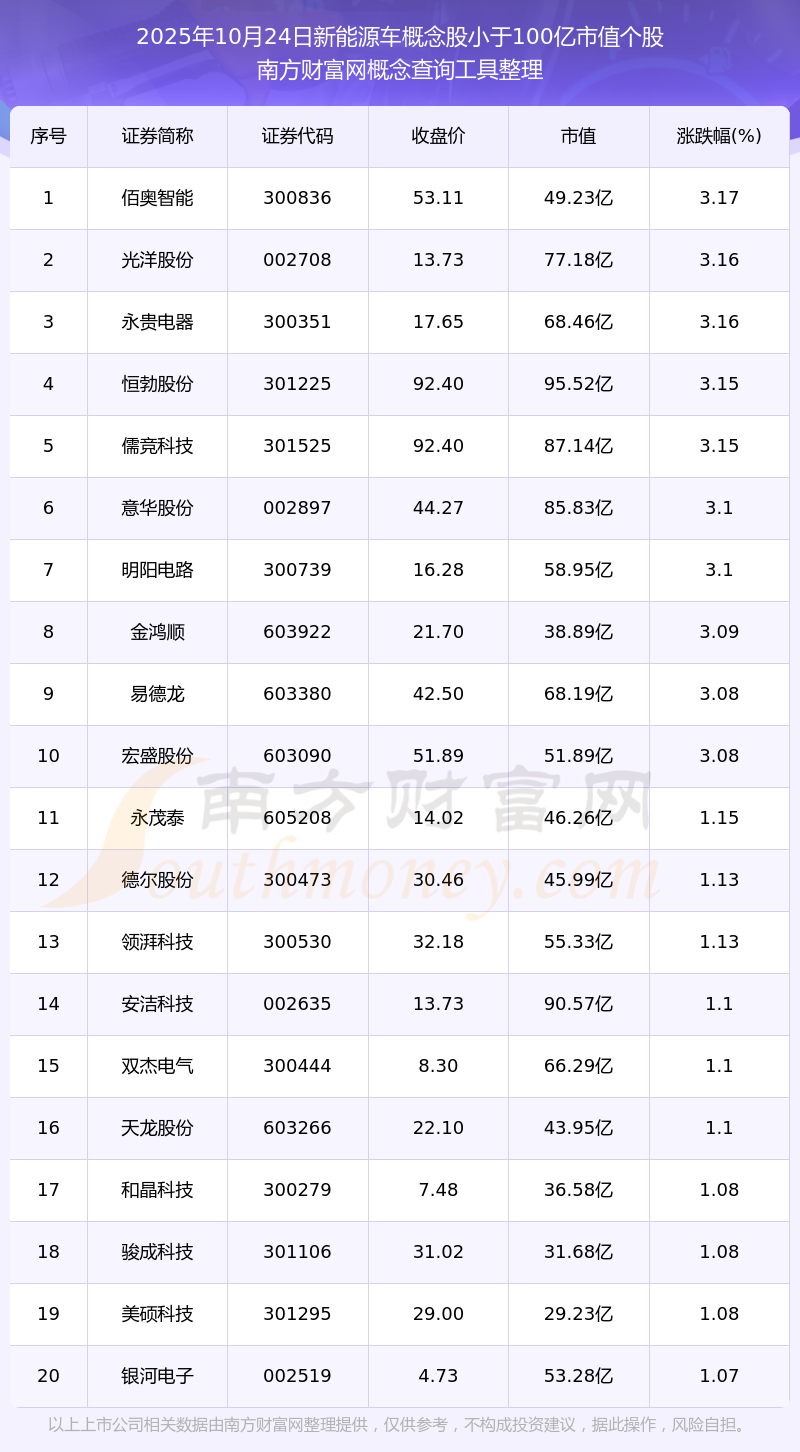 截止2025年10月24日,新能源車概念股市值小于100億的個(gè)股共有28只。其中,市值較高的有鴻日達(dá)、恒勃股份、安潔科技,市值分別為98.37億元、95.52億元、90.57億元。
