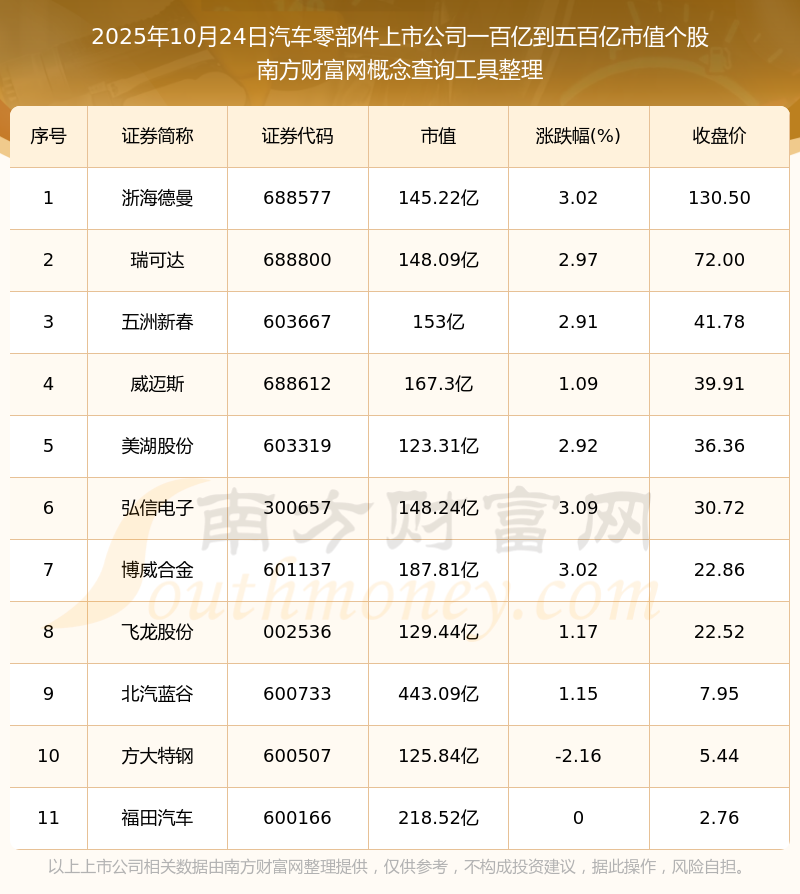 截止2025年10月24日,汽車零部件上市公司市值一百億到五百億的個(gè)股共有11只。其中,市值較高的有北汽藍(lán)谷、福田汽車、博威合金,市值分別為443.09億元、218.52億元、187.81億元。