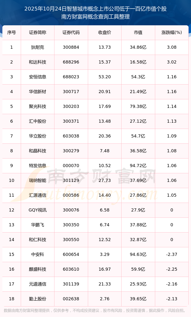 截止2025年10月24日,智慧城市概念上市公司市值低于一百億的個(gè)股共有18只。其中,市值較高的有特發(fā)信息、中安科、聚光科技,市值分別為94.72億元、94.63億元、79.38億元。