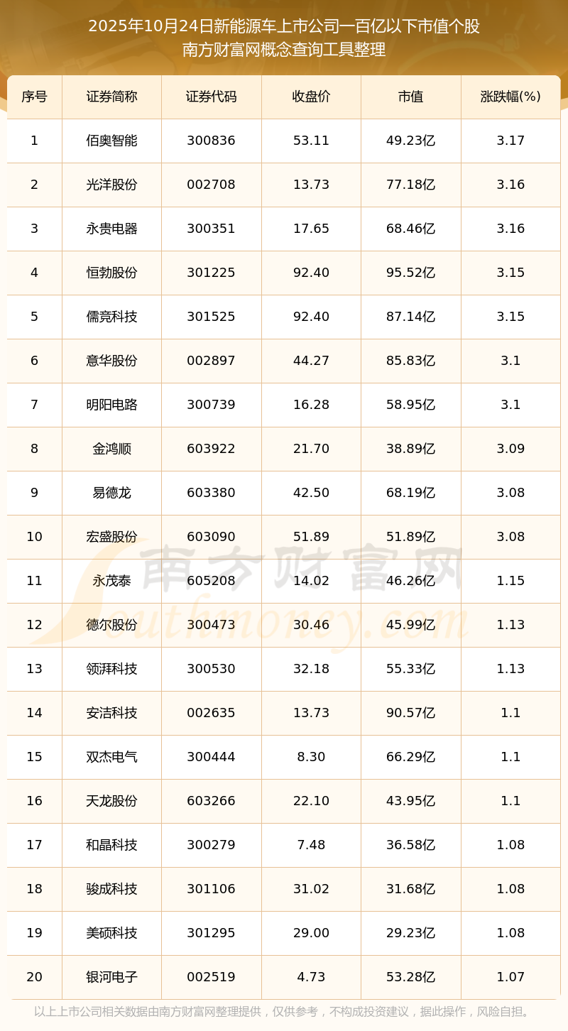 截止2025年10月24日,新能源車上市公司市值一百億以下的個股共有28只。其中,市值較高的有鴻日達(dá)、恒勃股份、安潔科技,市值分別為98.37億元、95.52億元、90.57億元。