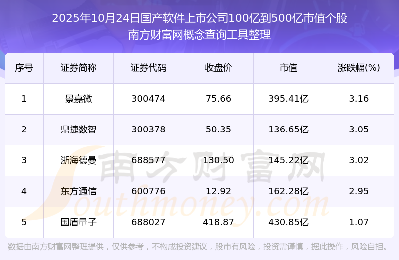 截止2025年10月24日,國(guó)產(chǎn)軟件上市公司市值100億到500億的個(gè)股共有5只。其中,市值較高的有國(guó)盾量子、景嘉微、東方通信,市值分別為430.85億元、395.41億元、162.28億元。