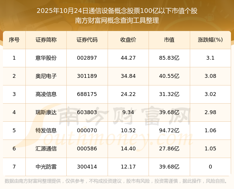 截止2025年10月24日,通信設(shè)備概念股票市值100億以下的個股共有7只。其中,市值較高的有特發(fā)信息、意華股份、奧尼電子,市值分別為94.72億元、85.83億元、40.55億元。