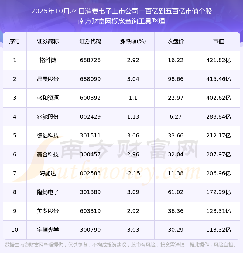 截止2025年10月24日,消費(fèi)電子上市公司市值一百億到五百億的個(gè)股共有10只。其中,市值較高的有格科微、晶晨股份、盛和資源,市值分別為421.82億元、415.46億元、402.62億元。