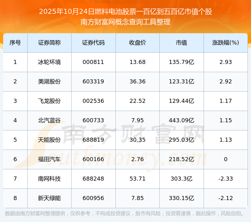 截止2025年10月24日,燃料電池股票市值一百億到五百億的個(gè)股共有8只。其中,市值較高的有北汽藍(lán)谷、新天綠能、南網(wǎng)科技,市值分別為443.09億元、330.15億元、303.3億元。