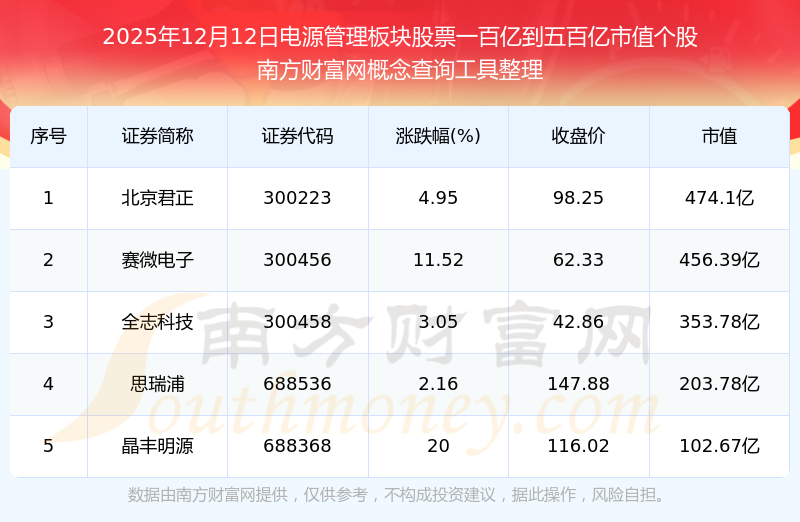 截止2025年12月12日,電源管理板塊股票市值一百億到五百億的個(gè)股共有5只。其中,市值較高的有北京君正、賽微電子、全志科技,市值分別為474.1億元、456.39億元、353.78億元。