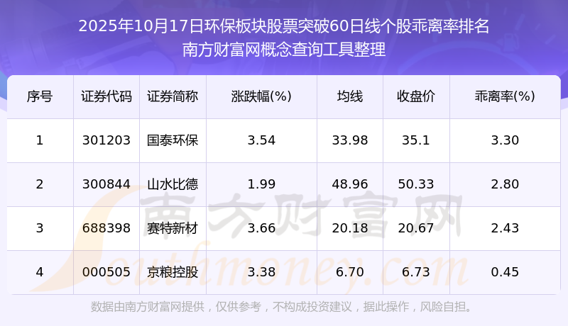 2025年10月17日環(huán)保板塊股票突破60日線個(gè)股乖離率排名