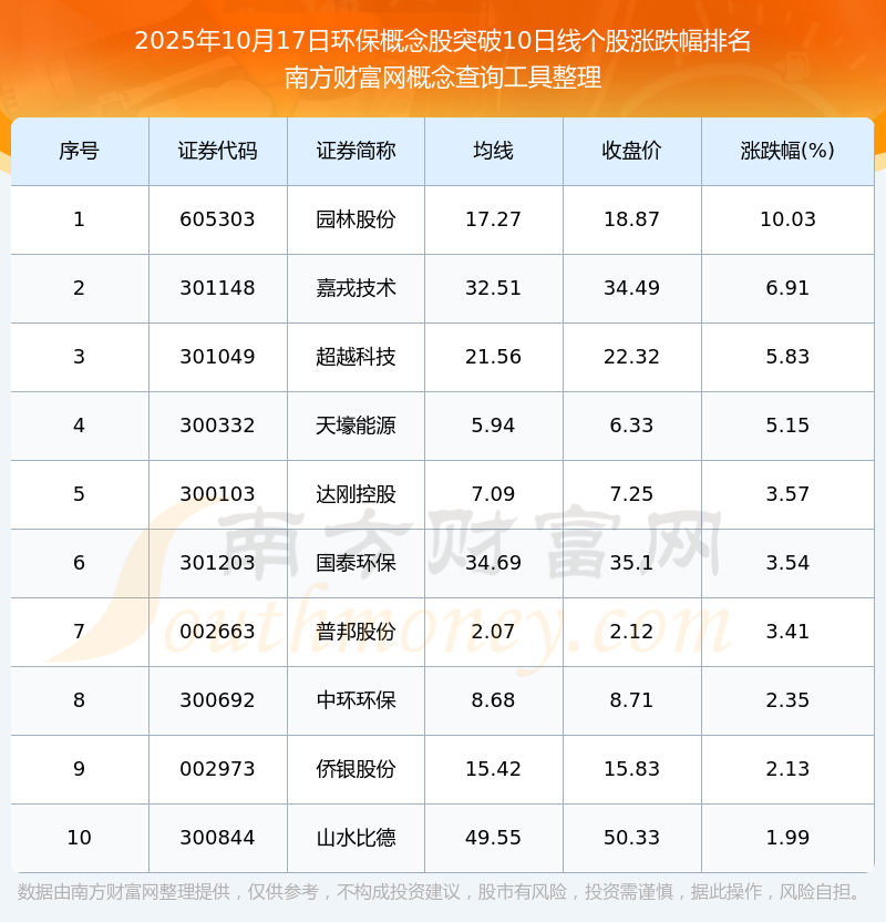 2025年10月17日環(huán)保概念股突破10日線個股漲跌幅排名