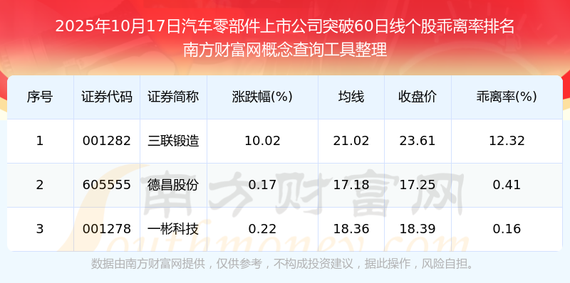 2025年10月17日汽車(chē)零部件上市公司突破60日線個(gè)股乖離率排名