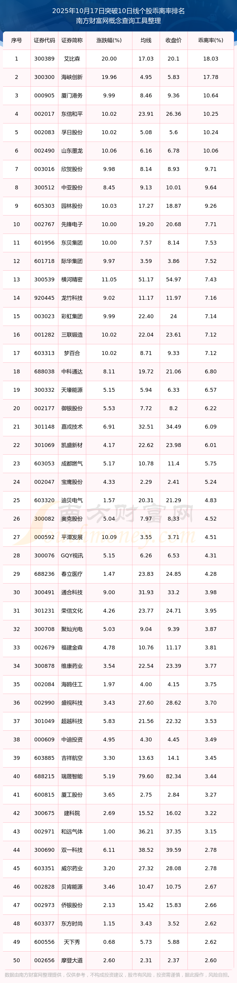 根據(jù)南方財富網(wǎng)概念查詢工具數(shù)據(jù)統(tǒng)計,截止2025年10月17日收盤,共有134只個股收盤價向上突破了10日線,其中乖離率較大的個股有艾比森、海峽創(chuàng)新、廈門港務(wù)、東信和平、孚日股份等,乖離率分別為18.03%、17.78%、10.64%、10.25%、10.24%。