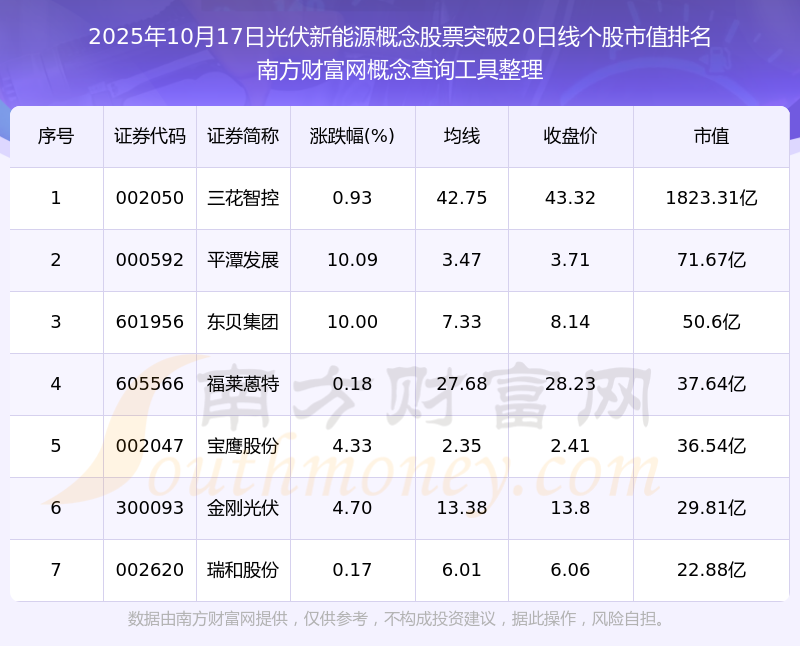 2025年10月17日光伏新能源概念股票突破20日線個股市值排名