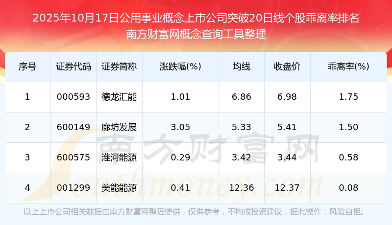 2025年10月17日公用事業(yè)概念上市公司突破20日線個股乖離率排名