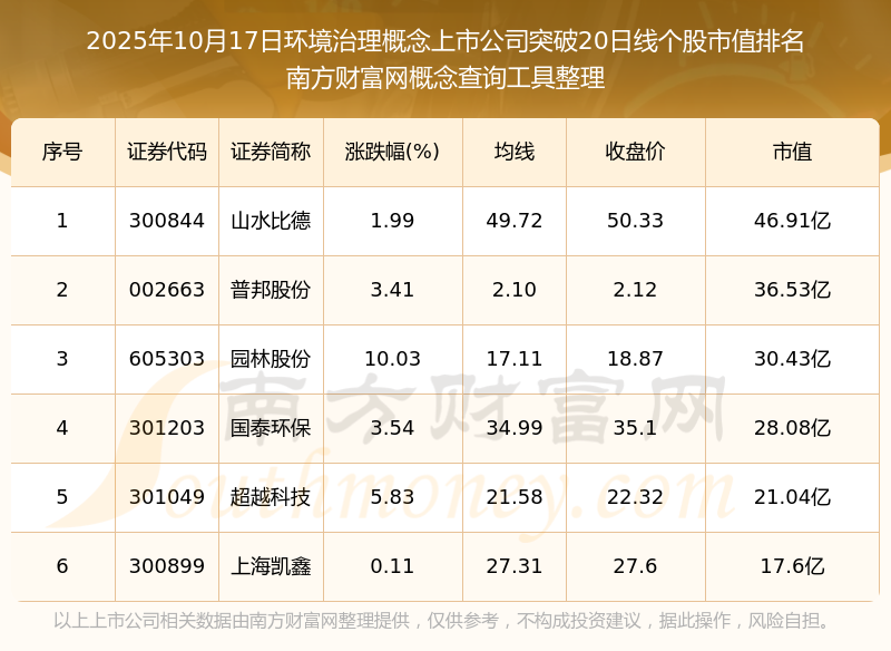 2025年10月17日環(huán)境治理概念上市公司突破20日線個股市值排名