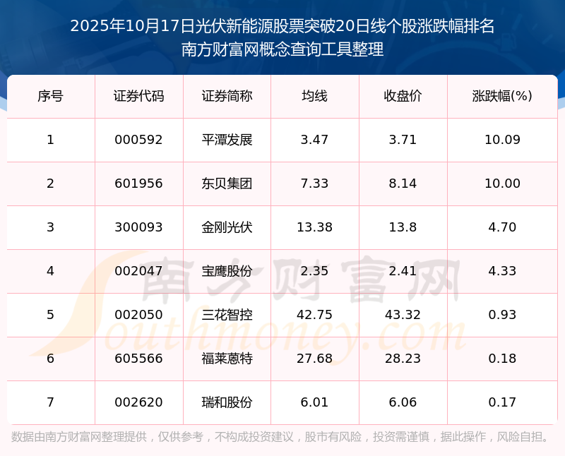 2025年10月17日光伏新能源股票突破20日線個(gè)股漲跌幅排名