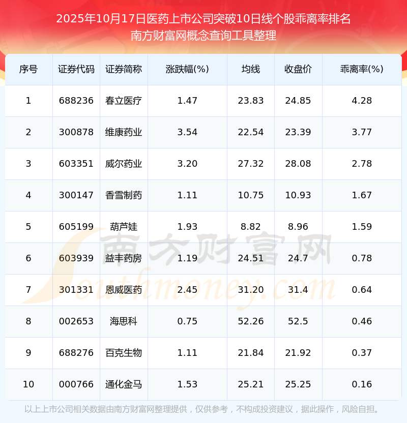 2025年10月17日醫(yī)藥上市公司突破10日線個(gè)股乖離率排名