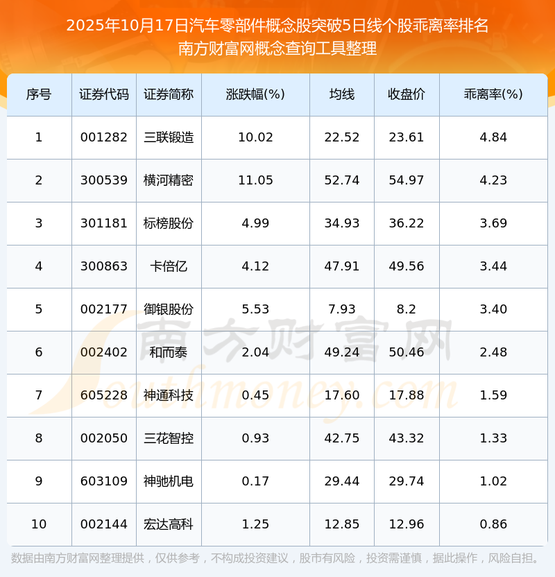 2025年10月17日汽車(chē)零部件概念股突破5日線個(gè)股乖離率排名