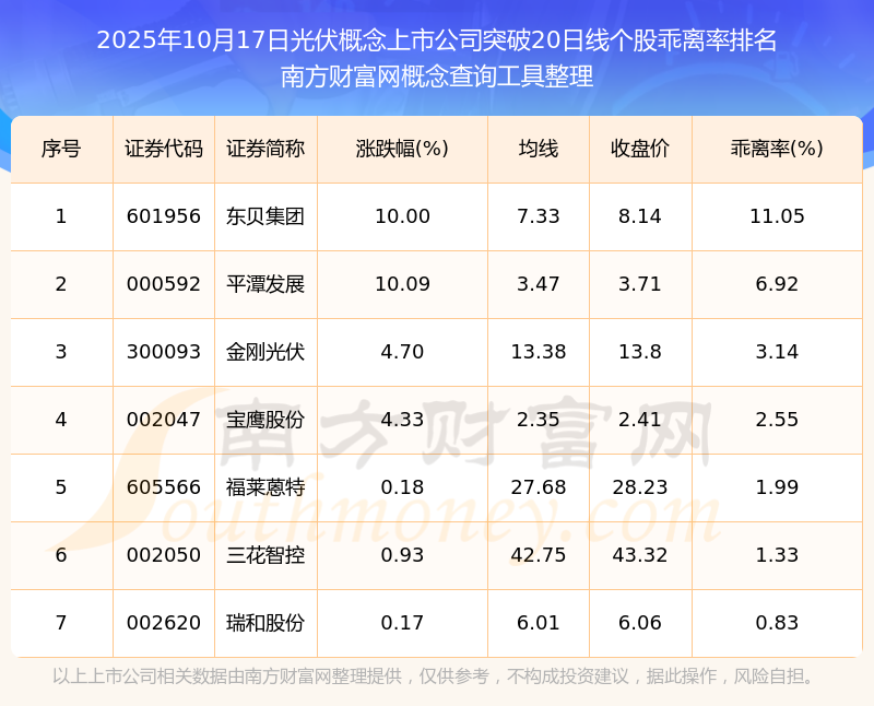 2025年10月17日光伏概念上市公司突破20日線個(gè)股乖離率排名
