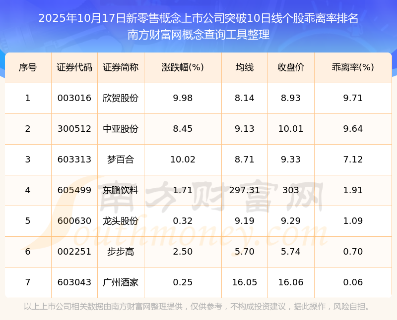 根據(jù)南方財富網(wǎng)概念查詢工具數(shù)據(jù)統(tǒng)計,截止2025年10月17日收盤,新零售概念上市公司共有7只個股收盤價向上突破了10日線。其中乖離率較大的個股有欣賀股份、中亞股份、夢百合等,乖離率分別為9.71%、9.64%、7.12%。
