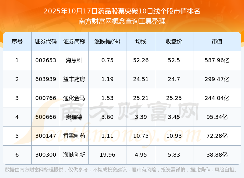 根據(jù)南方財富網(wǎng)概念查詢工具數(shù)據(jù)統(tǒng)計,截止2025年10月17日收盤,藥品股票共有6只個股收盤價向上突破了10日線。其中市值較大的個股有海思科、益豐藥房、通化金馬等,市值分別為587.96億、299.47億、244.04億。