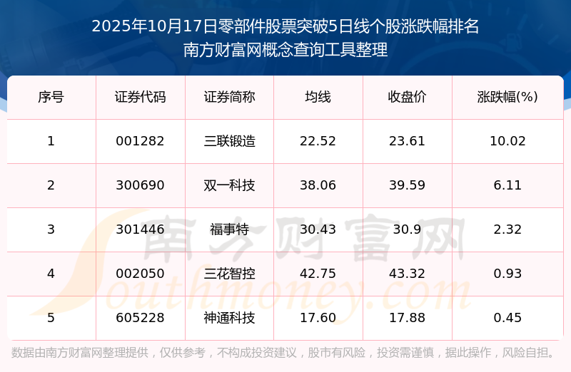 根據(jù)南方財富網(wǎng)概念查詢工具數(shù)據(jù)統(tǒng)計,截止2025年10月17日收盤,零部件股票共有5只個股收盤價向上突破了5日線。其中漲幅較大的個股有三聯(lián)鍛造、雙一科技、福事特等,漲幅分別為10.02%、6.11%、2.32%。