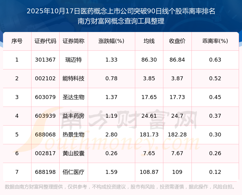 2025年10月17日醫(yī)藥概念上市公司突破90日線個股乖離率排名
