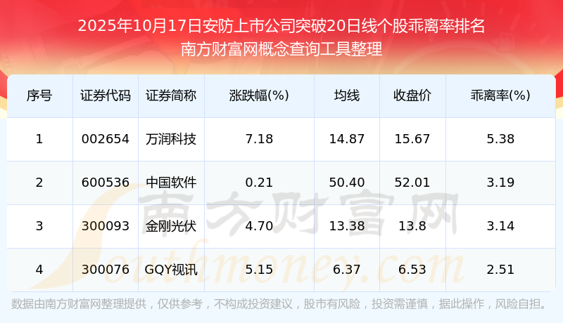 根據(jù)南方財富網概念查詢工具數(shù)據(jù)統(tǒng)計,截止2025年10月17日收盤,安防上市公司共有4只個股收盤價向上突破了20日線。其中乖離率較大的個股有萬潤科技、中國軟件、金剛光伏等,乖離率分別為5.38%、3.19%、3.14%。
