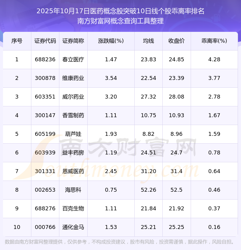 2025年10月17日醫(yī)藥概念股突破10日線個(gè)股乖離率排名