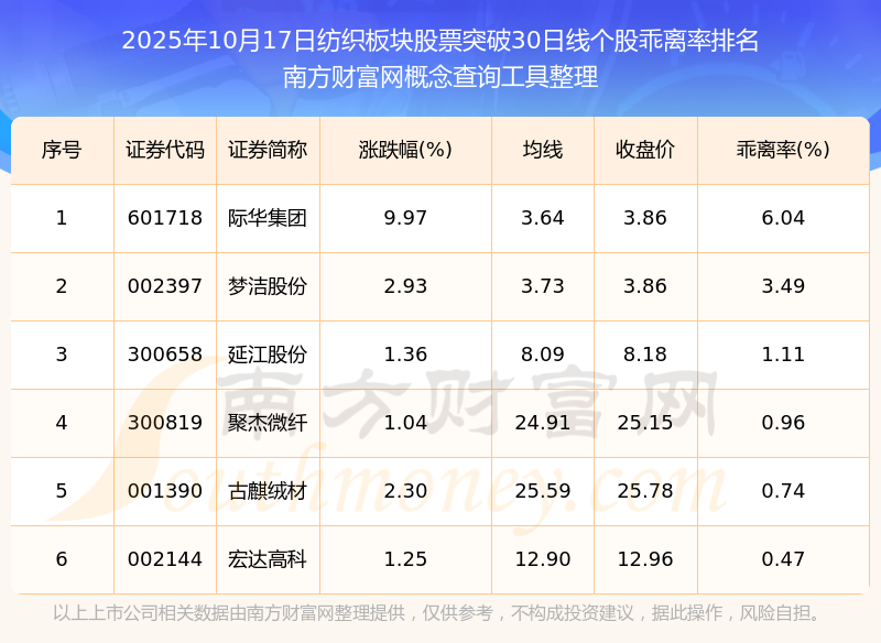 2025年10月17日紡織板塊股票突破30日線個(gè)股乖離率排名
