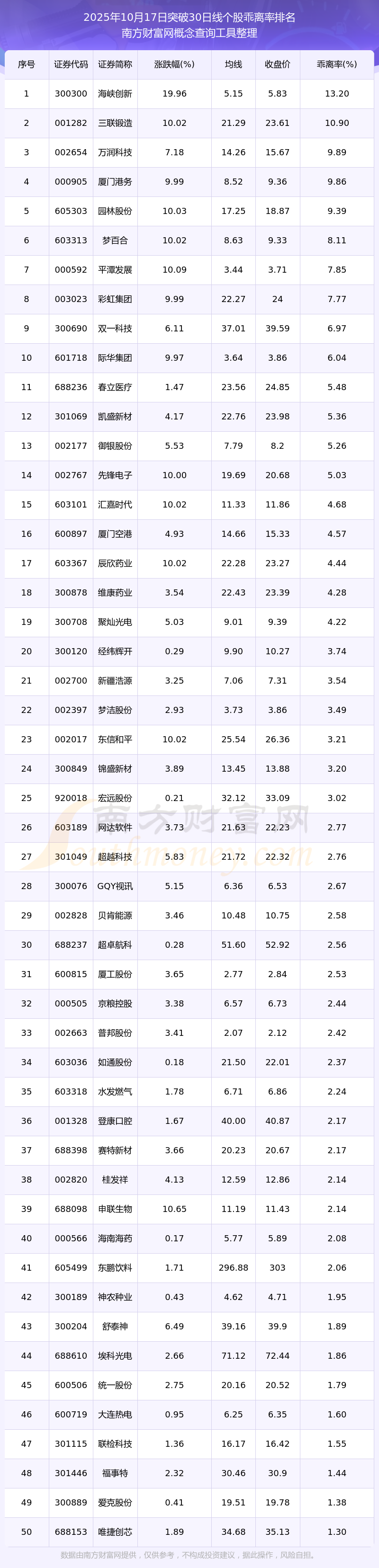 根據(jù)南方財富網(wǎng)概念查詢工具數(shù)據(jù)統(tǒng)計,截止2025年10月17日收盤,共有100只個股收盤價向上突破了30日線,其中乖離率較大的個股有海峽創(chuàng)新、三聯(lián)鍛造、萬潤科技、廈門港務、園林股份等,乖離率分別為13.20%、10.90%、9.89%、9.86%、9.39%。