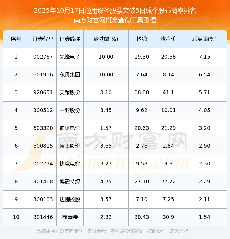 2025年10月17日通用設(shè)備股票突破5日線個股乖離率排名