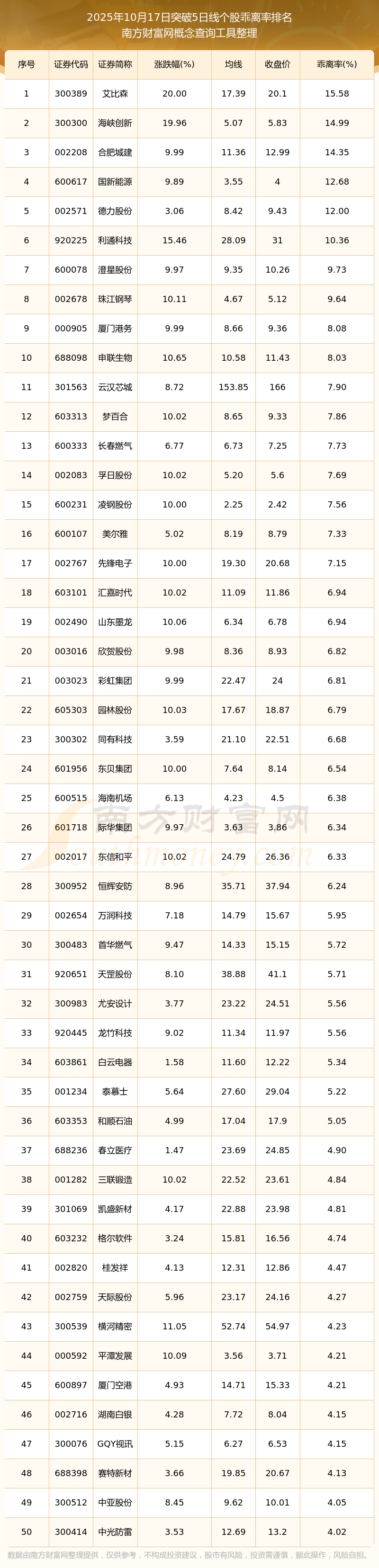 根據(jù)南方財富網(wǎng)概念查詢工具數(shù)據(jù)統(tǒng)計,截止2025年10月17日收盤,共有264只個股收盤價向上突破了5日線,其中乖離率較大的個股有艾比森、海峽創(chuàng)新、合肥城建、國新能源、德力股份等,乖離率分別為15.58%、14.99%、14.35%、12.68%、12.00%。