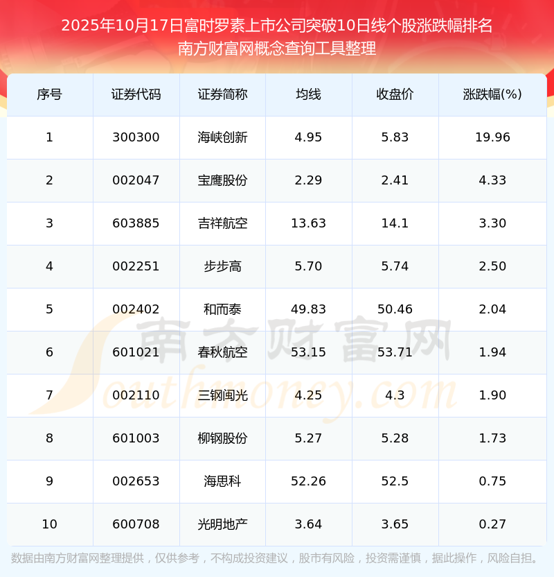 2025年10月17日富時(shí)羅素上市公司突破10日線個(gè)股漲跌幅排名