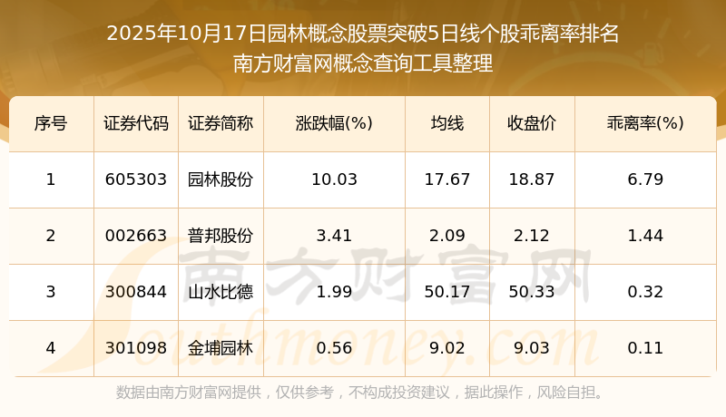 根據(jù)南方財富網(wǎng)概念查詢工具數(shù)據(jù)統(tǒng)計,截止2025年10月17日收盤,園林概念股票共有4只個股收盤價向上突破了5日線。其中乖離率較大的個股有園林股份、普邦股份、山水比德等,乖離率分別為6.79%、1.44%、0.32%。