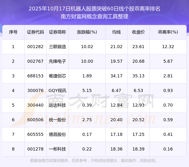 2025年10月17日機(jī)器人股票突破60日線個(gè)股乖離率排名