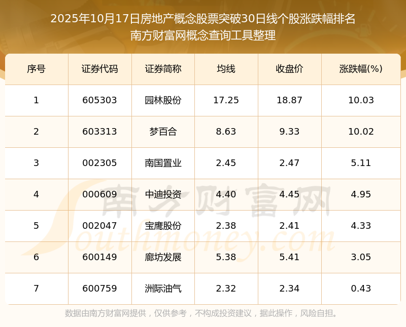 根據(jù)南方財富網(wǎng)概念查詢工具數(shù)據(jù)統(tǒng)計,截止2025年10月17日收盤,房地產(chǎn)概念股票共有7只個股收盤價向上突破了30日線。其中漲幅較大的個股有園林股份、夢百合、南國置業(yè)等,漲幅分別為10.03%、10.02%、5.11%。