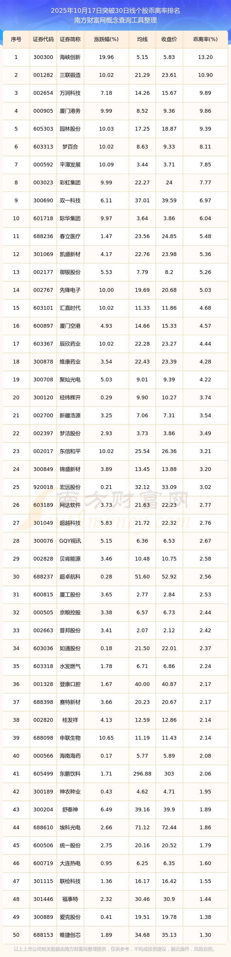 根據(jù)南方財富網(wǎng)概念查詢工具數(shù)據(jù)統(tǒng)計,截止2025年10月17日收盤,共有100只個股收盤價向上突破了30日線,其中乖離率較大的個股有海峽創(chuàng)新、三聯(lián)鍛造、萬潤科技、廈門港務、園林股份等,乖離率分別為13.20%、10.90%、9.89%、9.86%、9.39%。