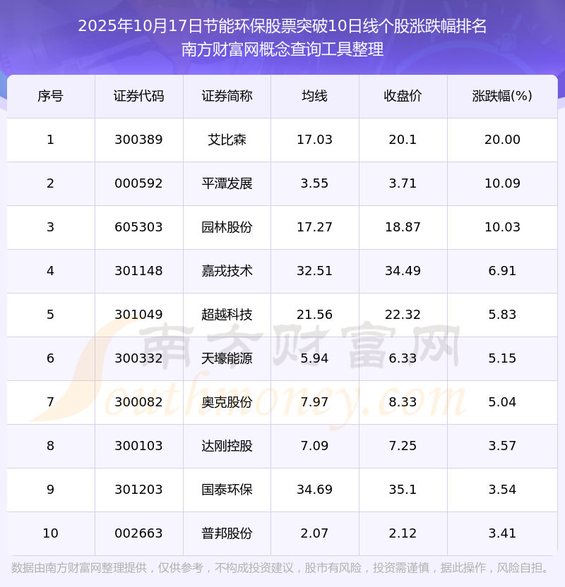 2025年10月17日節(jié)能環(huán)保股票突破10日線個股漲跌幅排名