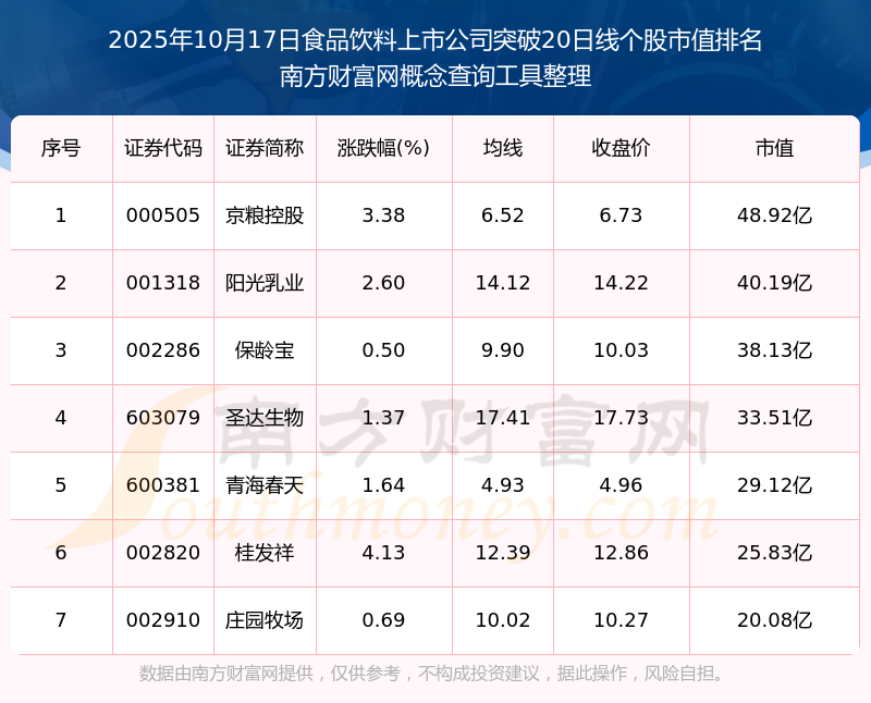 根據(jù)南方財富網(wǎng)概念查詢工具數(shù)據(jù)統(tǒng)計,截止2025年10月17日收盤,食品飲料上市公司共有7只個股收盤價向上突破了20日線。其中市值較大的個股有京糧控股、陽光乳業(yè)、保齡寶等,市值分別為48.92億、40.19億、38.13億。