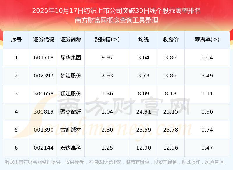 根據南方財富網概念查詢工具數(shù)據統(tǒng)計,截止2025年10月17日收盤,紡織上市公司共有6只個股收盤價向上突破了30日線。其中乖離率較大的個股有際華集團、夢潔股份、延江股份等,乖離率分別為6.04%、3.49%、1.11%。
